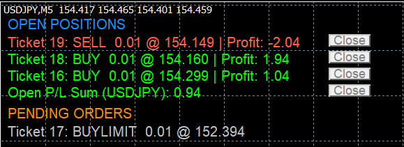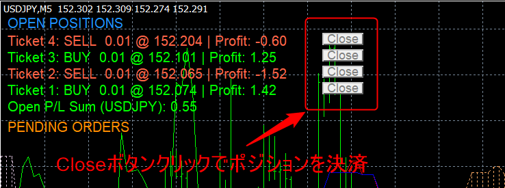 • 左上リスト横の Close ボタンで成行クローズ/待機取消。